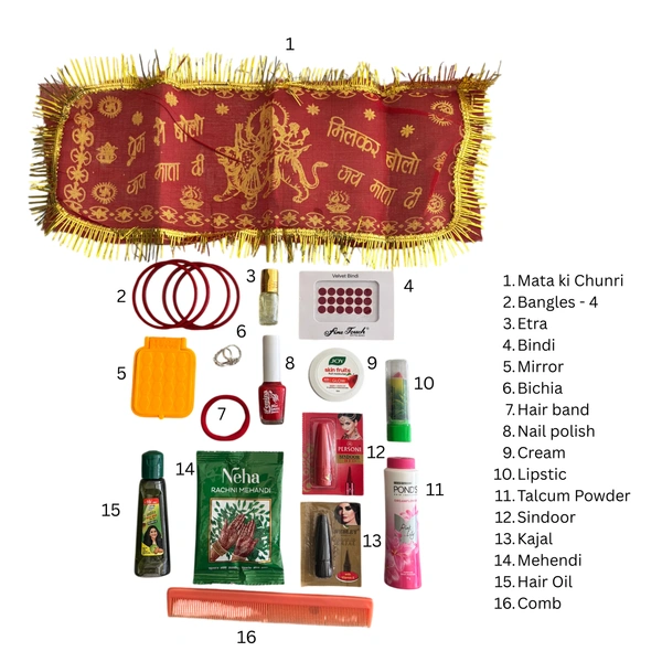 Mata ka 16 Shringaar refers to the sixteen traditional adornments offered to and used to beautify the idol or image of the Divine Mata Rani during worship. Each element of the Shringaar symbolizes prosperity, auspiciousness, and divine grace, and is believed to please the Goddess, invoking her blessings for health, wealth, and happiness.
